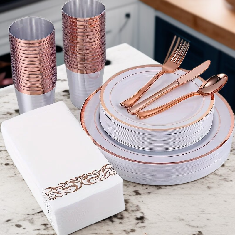 ● 一次性金邊塑料餐具套裝,華麗設計提升聚會質感,適合婚宴、派對及各式活動,輕鬆招待25人,省心又體面。